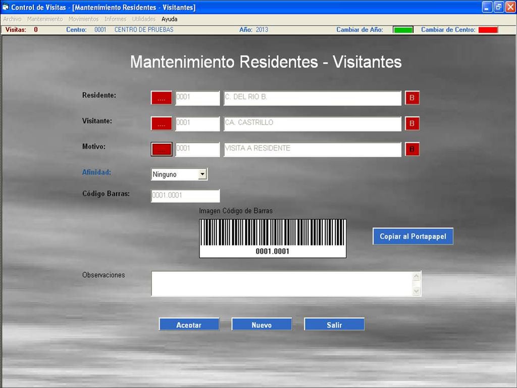 - Asociar los residentes y los servicios con los visitantes para poder genera un código de barras que nos permita tener identificada la visita y estimar el tiempo que pasan dentro del centro y que número de personas permanecen en su interior.